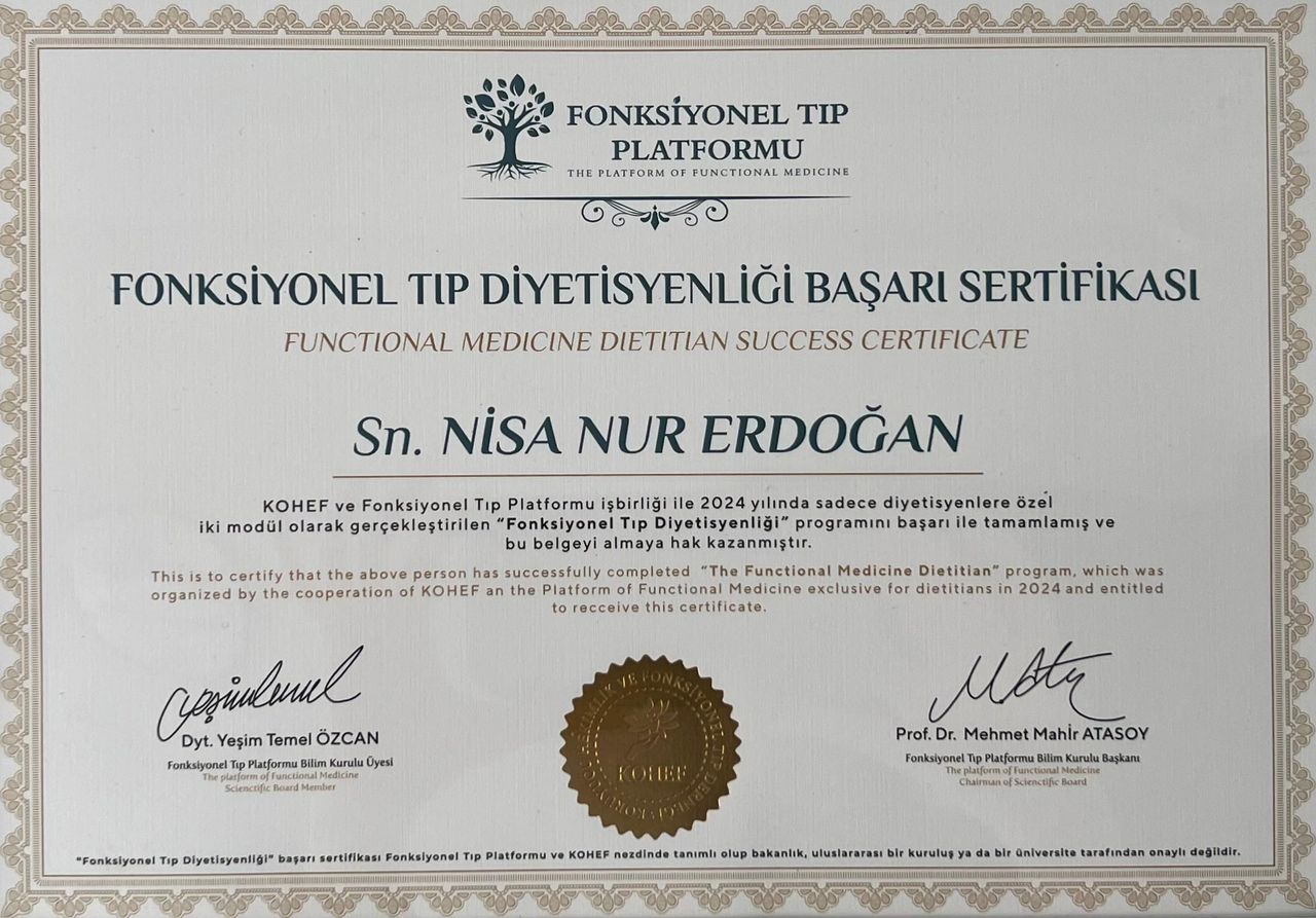 Fonksiyonel Tıp Diyetisyeni Nisa Erdoğan, Beslenme ve Diyetetik lisans eğitimini Necmettin Erbakan Üniversitesi’nde tamamlamıştır.